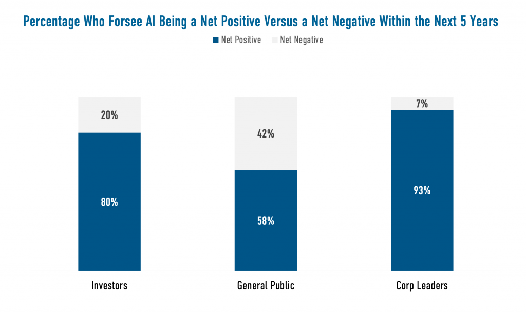 Positive Potential of AI: Majorities of all three groups believe AI will be a net positive for society within the next five years. Corporate leaders’ enthusiasm (93%) outpaces the general public (58%) and investors (80%).