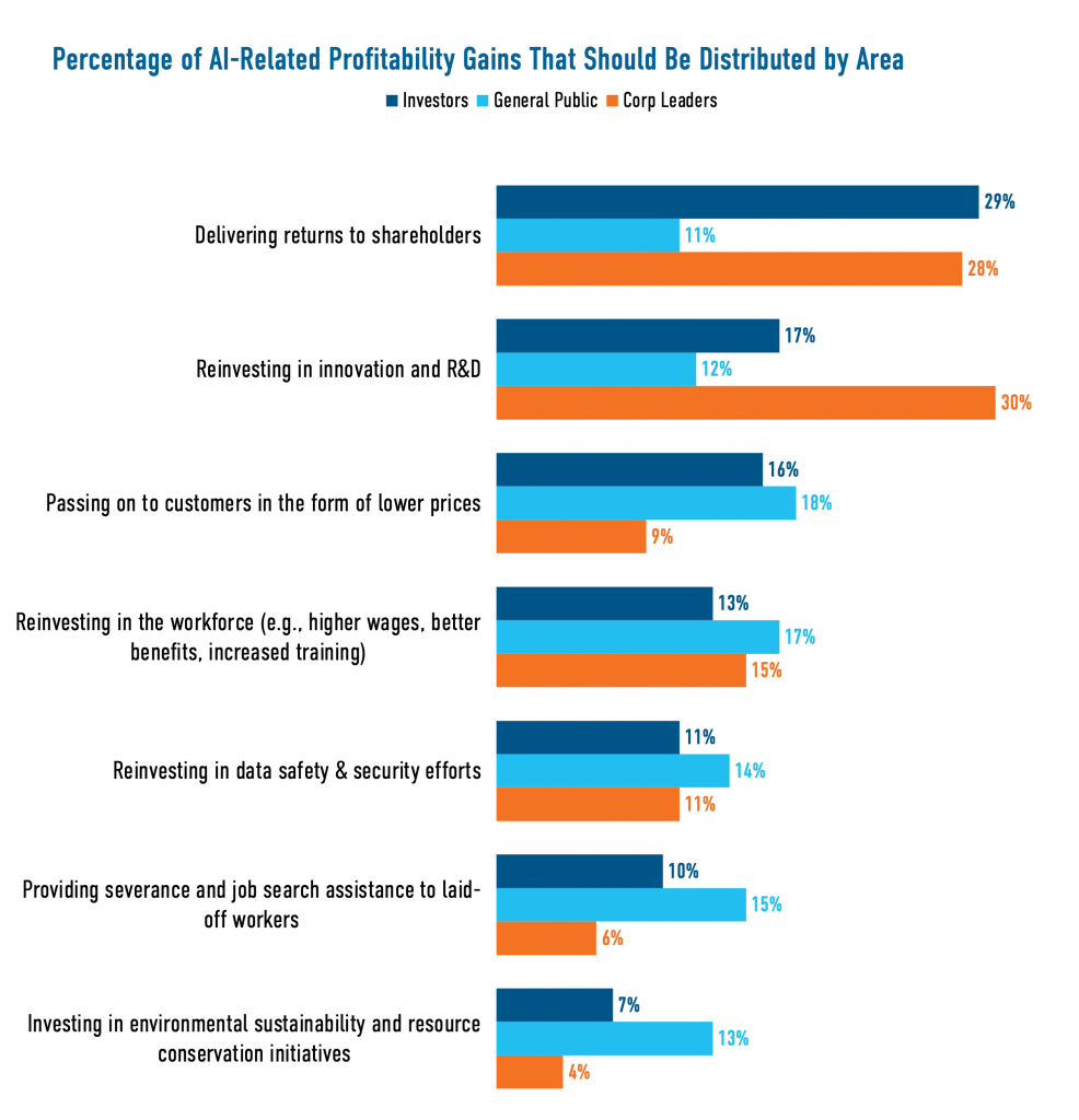 The Degree of Expected Investment in Safety and Workforce Support: Investors and the public expect companies to spend more than 5% of total AI investment on safety, while corporate leaders say they plan to allocate between 1 and 5%. When asked about how they plan to redistribute AI-related profitability gains, executives evince less emphasis on worker training efforts (17%) than on delivering gains to shareholders (28%) and reinvesting in R&D (30%).