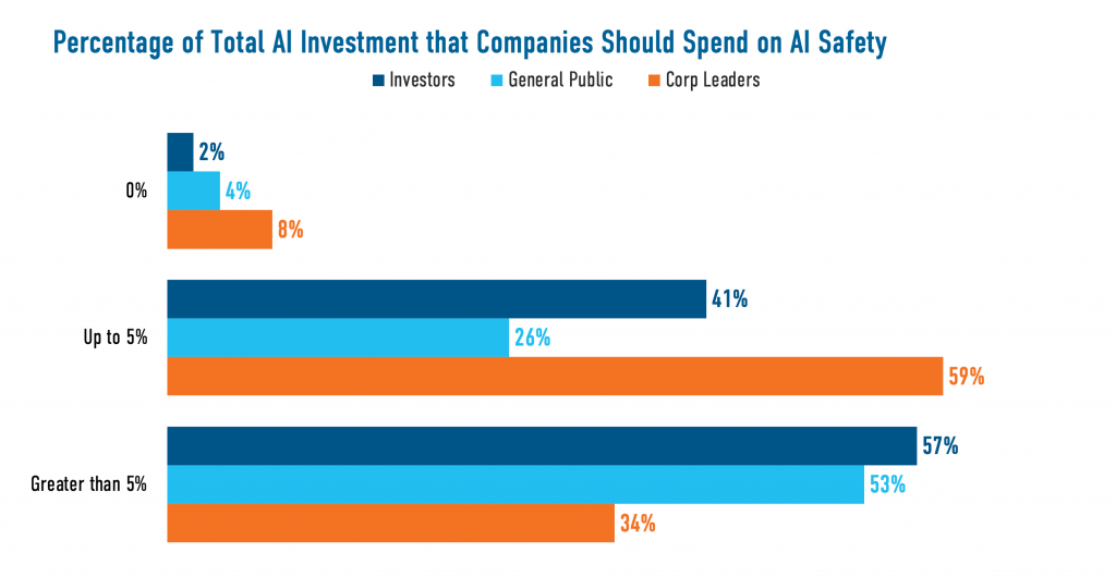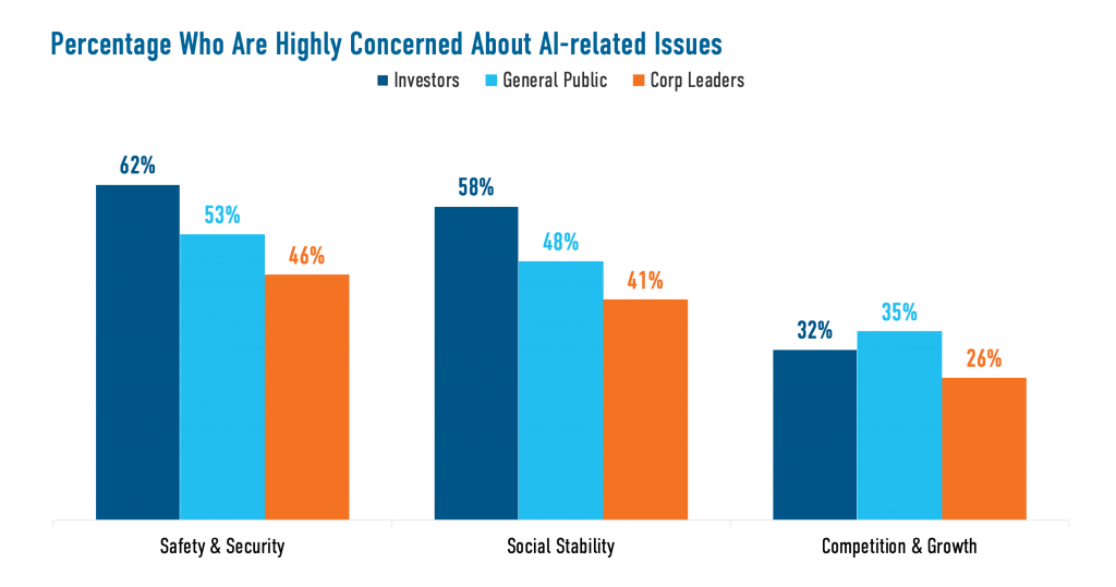 Shared Concern for Safety: Majorities or pluralities of each group rate AI safety and security a top concern (general public: 53%, investors: 62%, corporate leaders: 46%).