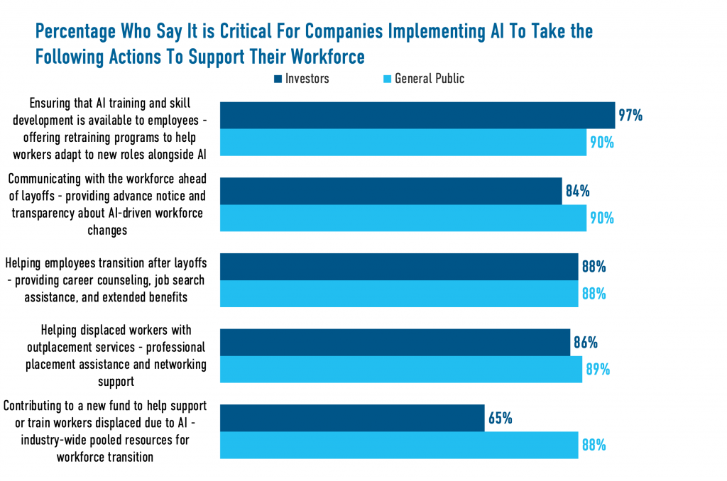 Commitment to Workforce Support: Significant majorities of the general public (90%) and investors (97%) say it is critical that companies ensure that AI training and development is available to employees, and roughly three-quarters of corporate leaders say they are planning to implement AI training to support their workers.