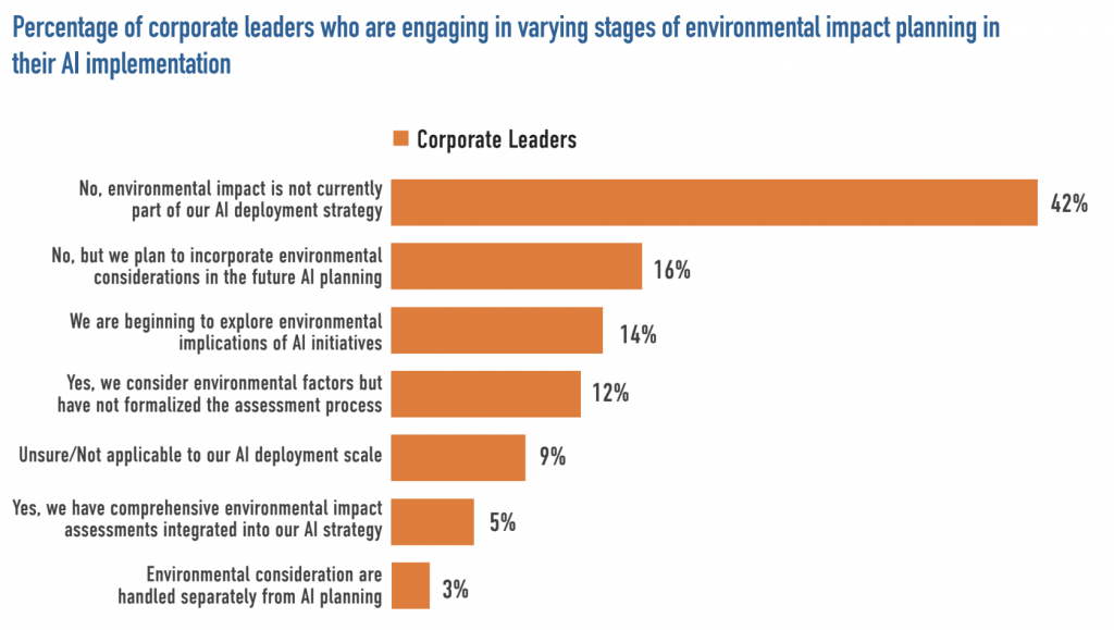 Environmental planning: Roughly a third of both the public and corporate leaders say increased corporate AI usage will have negative impacts on the environment. Currently, only 17% of leaders are including environmental impact planning in their AI roadmap, and 42% say it is not a part of their strategy.